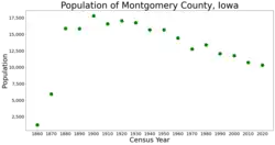 Montgomery County is a county located in the southwestern area of the U.S. state of Iowa. As of the 2020 United States census, the population was 10,330.[1] Its population has declined since a peak in 1900, since urbanization and decline of family farms. The county seat is Red Oak.[2] The county was founded by European-American migrants from eastern areas in 1851.[3] It was named in honor of Richard Montgomery, an American Revolutionary War general killed in 1775 while trying to capture Quebec City, Canada.