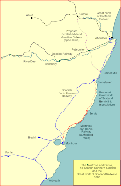 The NBR had sponsored a nominally independent line from Arbroath to Montrose (the North British, Arbroath and Montrose Railway), which obtained its authorising act of Parliament, the North British, Arbroath, and Montrose Railway Act 1871 (34 & 35 Vict. c. cxxiii), on 13 July 1871, capital £171,580. There was some delay in construction, but it opened to goods traffic in 1881, and to passengers in 1883.[1][7] It had its own station at Montrose, and joined the Caledonian main line at Kinnaber Junction, a few miles north of Montrose. However, the development of the Bervie line, and the new construction at its north end onward to Stonehaven, never took place.
