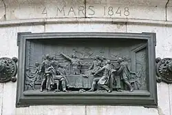 The stone pedestal is surrounded with twelve high reliefs in bronze, made by Léopold Morice.[2] Connected with rosettes and arranged at eye level, they constitute a chronology of events marking the history of the French Republic, between 1789 and 1880 :