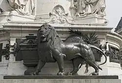 The bronze statue is 9.5 m high on a 15.5 m stone pedestal with a diameter of 13 m at ground level.[3] The pedestal is decorated with 3 statues each representing one of the 3 words of the french motto, liberty, equality, fraternity. Around the pedestal, under those statues, are a group of 12 high reliefs in bronze representing significant dates for the French Republic. A bronze statue of a lion symbolizing universal suffrage is at the foot of the monument. A fountain was added in 2013 at ground level.