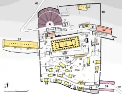The Monument of Aemilius Paullus was erected in the Sanctuary of Apollo at Delphi shortly after 167 BCE in order to commemorate the Roman victory over King Perseus of Macedon at the Battle of Pydna. It incorporated an incomplete pillar originally intended as a base for a portrait of King Perseus, which would have established the Macedonian presence in Delphi and reminded the Delphians of the tradition of friendship between them and the royal family.[1] Aemilius Paullus repurposed the king's monument to celebrate himself and Rome's victory, noting that "it was only proper that the conquered should give way to the victors."[2] The Monument of Aemilius Paullus stood in front of the Temple of Apollo along with two other commemorative pillars to Eumenes II of Pergamon and Prusias II of Bithynia.[3] However, this pillar dominates over the other two. The completed monument had a bronze equestrian statue that sat on top of a rectangular pillar over 9 meters high.[4] Although the bronze statue that originally sat atop the pillar no longer remains, the cuttings in the plinth show that the horse would have been in a rearing position. An inscription at the base of the pillar survived, L(ucius) Aimilius L(uci) f(ilius) inperator de rege Perse / Macedonibusque cepet, which translated, reads, "Lucius Aemelius, son of Lucius, Imperator, took it from King Perseus and the Macedonians."[5]