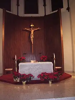 Above the altar (from left to right): Saint Athanasius, Saint Jerome, Saint Augustine, Saint Ambrose, The Holy Trinity (center), Saint Matthew, Saint John the Evangelist, Saint Isidore of Seville, and Saint Thomas Aquinas.