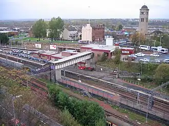 Motherwell looking from the south, with stabling sidings in the foreground. Platform 4 is closest to the camera. The bridge in the foreground has recently been replaced with a DDA compliant one.