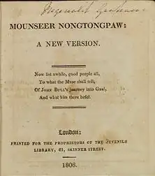 Mounseer Nongtongpaw was originally published by William Godwin's publishing firm, M. J. Godwin, in 1807 as part of its Juvenile Library series.[1] English editions have been located for 1811, 1812, 1823, and 1830 and Philadelphia editions have been located for 1814 and c. 1824.[2] The original edition was illustrated by a protégé of Godwin, William Mulready.[3] Shelley biographer Emily Sunstein speculates that some of the verses may have been written to match illustrations that were already designed.[4] The copper plate engravings are reproduced in Peter and Iona Opie's Nursery Companion.