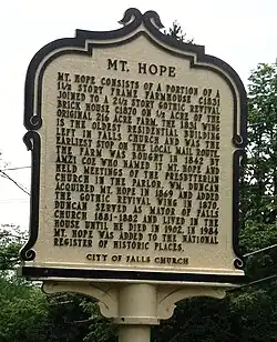 Mount Hope is a historic home located at Falls Church, Virginia. It was built in the 1830s, as a 1+1⁄2-story, frame I-house dwelling. It consists of three parts: a frame dwelling built about 1830; a 2+1⁄2-story, 3-bay, Gothic Revival brick dwelling built in 1869; and a 1-bay brick section that joins the two. The 1869 section features a pair of corbel topped chimneys that pierce the apex of the gable roof, which has a substantial overhang on all elevations. It also has a three-bay porch with low hipped roof across the front facade.[3]