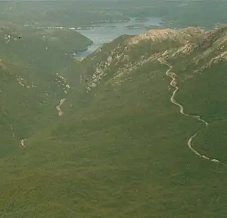 The Mount Jukes Road (22 kilometres (14 mi) in length)[4] was constructed by the Hydro in the 1980s at the time the Crotty Dam was made. It connects southern Queenstown with Darwin Dam, where the previously utilised North Mount Lyell Railway formation between the Linda Valley and Crotty was submerged by Lake Burbury.