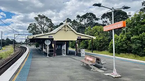 Mount Kuring-gai railway station is a suburban railway station located on the Main North line, serving the Sydney suburb of Mount Kuring-gai. It is served by Sydney Trains T1 North Shore Line services and some early morning and late night intercity Central Coast & Newcastle Line services.