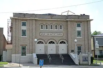Mount Zion Baptist Church is a historic church at 900 Cross Street in Little Rock, Arkansas. It is a buff brick structure with modest Prairie School features on its exterior, with a three-part facade articulated by brick pilasters, and a trio of entrances set in the center section above a raised basement. The interior of the church is extremely elaborate in its decoration, with a pressed-metal ceiling, elaborate central copper light fixture, and banks of stained glass windows. The church was built in 1926 for a predominantly African-American congregation founded in 1877.[2]