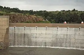 The concrete arch portion of Mountain Park Dam functions as an uncontrolled, overflow spillway. The crest is at the top of the exclusive flood control pool at elevation 1,414.0, and is 320 feet (98 m) long measured along the axis of the dam. Concrete piers and training walls at each end of the spillway direct floodwater into and over the crest. Floodwaters fall into a plunge pool energy dissipater at the toe of the dam. The spillway is designed for a maximum discharge of 38,300 cubic feet (1,080 m3) per second with the reservoir at elevation 1,423.6 feet (433.9 m).