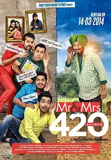 Mr & Mrs 420 is a 2014 Punjabi comedy film directed by Ksshitij Chaudhary and starring Yuvraj Hans, Jassi Gill, Babbal Rai, Binnu Dhillon and Jaswinder Bhalla in lead roles. It was released worldwide on 14 March 2014.[1] A sequel titled Mr & Mrs 420 Returns was released on 15 August 2018. The film is an adaptation of Sailesh Dey's Bengali play Joymakali Boarding.[2][3]