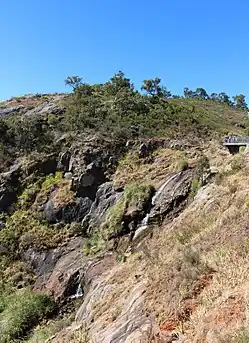 The park contains the 50-metre (164 ft) Lesmurdie Falls, formed by Lesmurdie Brook emptying over the Scarp, and the surrounding riparian and heath vegetation.[2] Wandoo, jarrah and marri trees can all be found within the park. A gravity hill exists near the carpark on Palm Terrace.