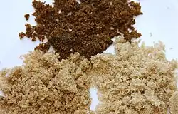 Muscovado is a type of partially refined to unrefined sugar with a strong molasses content and flavour, and dark brown in colour. It is technically considered either a non-centrifugal cane sugar or a centrifuged, partially refined sugar according to the process used by the manufacturer.[1][2] Muscovado contains higher levels of various minerals than processed white sugar.[3][4] Its main uses are in food and confectionery, and the manufacturing of rum and other forms of alcohol. The largest producer and consumer of muscovado is India.[5][6]