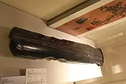 Each side of the drum represents a flag of the Manchu people.[18] Folkloric tradition dictates the drum's origin alongside the snare drum during the battles of the Eight Banner Military throughout the Qing Dynasty.[19] Traditionally the drum is often played whilst dancing and is accompanied by a harpist and a singer who recount traditional Chinese stories.[19] The Beijing Monochord Danxian is also commonly accompanied by the Baijiao.[17]