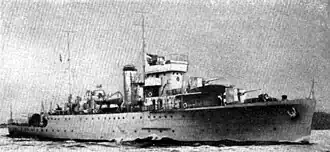 Armament consisted of three 120-millimetre (4.7 in) guns in single mounts on the ship's centreline, with two forward and one aft. Four 2-pounder (40 mm) pom-pom anti-aircraft (AA) guns were fitted, while four depth charge throwers provided an anti-submarine armament.[2] In 1943, the 40 mm guns were removed and replaced by five single-mounted 20 mm (0.79 in) AA cannon.[3]
