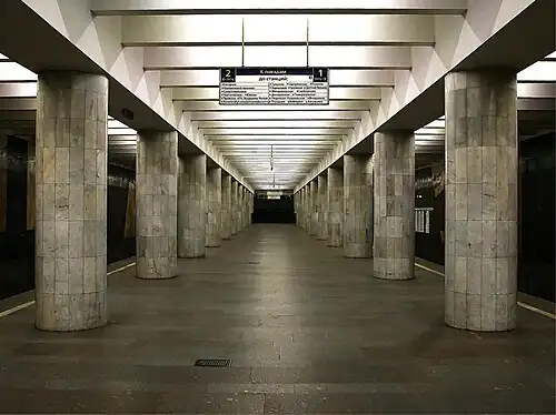 Nagatinskaya (Russian: Нагатинская) is a station of Serpukhovsko-Timiryazevskaya line of Moscow Metro. It was opened together with several other stations of the southern part of the line on 8 November 1983.[1] It lies underneath the surface with the depth of 13.5 metres (44 ft). The passenger dynamics for the station are 54,900 per hour on entry and 57,500 on exit.