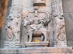A granite wall surrounds the temple, enclosing all its shrines. The temple has a five-tiered rajagopuram, the gateway tower. The sanctum of the temple is believed to have been carved out in a single stone. The image of Nanjundeswarar in the form of Lingam is housed in the sanctum. It is made of granite and appears red in colour. The northern part of the temple houses the image of Ulaganayagi, the consort of Nanjundeswarar.[3] The vimana, the shrine over the sanctum of Nanjundeswarar is similar to the ones in North Indian temples, with a spiral structure. The metal image of Chandrasekara is unique that the full image of Ganga is sculpted unlike the other temples where Shiva is sported with crescent alone. The shrine also houses the images of Vinayaka, Subramanya, Veerabhadra, Rishabandika, Palani Andavar, Mahishasuramardini, Anjaneya and Nataraja on the walls. Shiva in one of the sculptures is portrayed as a hunter, while Parvathi as a dancer. The Vinayaka idol is sported with one of his legs bent, while image of Kali is sported with a dancing posture. There are sculptures depicting Machavallabha emerging out of fish, soldier armed with sword and a goat worshipping Shiva. There are also sculptures of live creatures like cow, goat, elephant, swan, fish, snake, yali, horse, pig, tiger and bull. Similar to the Meenakshi Amman temple, there are six 6 ft (1.8 m) elephants guarding the sanctum of Nanjundeswarar. There are miniature sculptures of Rishabaruda, Balasubramanya, Kali, Brahma and Lakshmi Narayana on both sides of the elephants.[1] The image of Subramanya is sported with twelve arms.[4]
