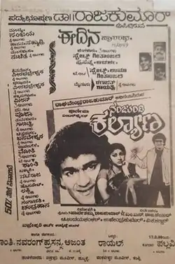 Nanjundi Kalyana (transl. Nanjundi's marriage) is a 1989 Indian Kannada-language romantic comedy film, directed by M. S. Rajashekar, starring newcomers Raghavendra Rajkumar and Malashri, with Girija Lokesh and Sundar Krishna Urs as the lead cast. The film was an industry hit and was the highest ever grossing Kannada movie at that time.[2] The movie saw a theatrical run of 90 weeks.[3][4]