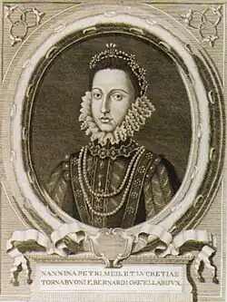 Lucrezia "Nannina" de' Medici (14 February 1448 – 14 May 1493), sometimes known by the longer name Lucrezia di Piero de' Medici including a patronymic, was the second daughter of Piero di Cosimo de' Medici and Lucrezia Tornabuoni. She was thus the elder sister of Lorenzo de' Medici. She married Bernardo Rucellai.