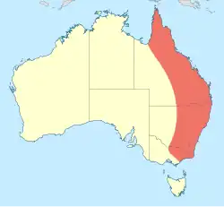 The reference field guide shows its distribution extends from the Northern Territory, to Queensland (except for northern Cape York), coastal New South Wales and coastal Victoria.