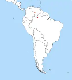Nannostomus anduzei is restricted to the Amazonian region of the South American continent and has only been formally reported from two localities in the north of that area. The first, and site of discovery, was 20 km (12 mi) north of the small Venezuelan town of Puerto Ayacucho in a small lagoon, in the upper regions of the Rio Orinoco, at 5° 50' N, 67° 30' W. The second site was some 700 km (430 mi) to the southeast, in the Lago Caatinga, off the Rio Ererê, a tributary of the Rio Negro at 0° 14' S; 63° 53' W. These limited data are reflected in the range map above, where it is not possible to say where else the species might be found. However, because these fish occasionally do appear in the aquarium trade (see also below), their true range likely is somewhat wider than indicated. While the two known sites are geographically widely separated in two river systems, the Orinoco and the Negro are linked by the Casiquiare canal, so migration between the two sites is possible. N. anduzei does not appear in a systematic list of fishes of Columbia,[8] though the northern Orinoco locality is only a few kilometres from the Colombian border. This could represent undersampling in what is a remote part of the forest.