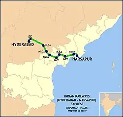 The train departs from Hyderabad at 21:45 hours and arrives in Narasapuram at 08:40 hours the next day. From Narasapuram, train departs at 18:55 hours and arrives in Hyderabad at 05:25 hours the next day. Train run with 6 air-conditioned coaches. The train operates daily and covers a distance of 461 km, via Gudivada, Vijayawada, Guntur, Nalgonda. This train is full entire year still South Central Railway (SCR) didn't provide more trains in this route. The Rake is shared by Narasapur–Nagarsol Express