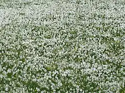 Although prized as an ornamental flower, some people consider narcissi unlucky, because they hang their heads implying misfortune, and hence refuse to have them in the house.[13] White narcissi are especially associated with death, especially the pure white N triandrus 'Thalia', and hence are considered grave flowers.[14][15] Indeed, in Ancient Greece narcissi were planted near tombs. Robert Herrick, describes them as portents of death, an association which also appears in the myth of Persephone and the underworld (see The Arts, below).