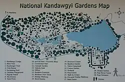 The National Kandawgyi Botanical Gardens (Burmese: ကန်တော်ကြီး အမျိုးသား ရုက္ခဗေဒ ဥယျာဉ်; formerly National Botanical Gardens) is a 177 hectare botanical garden located in the Alpine town of Pyin U Lwin (formerly Maymyo), Burma, situated at an elevation of 1000 metres (3,605 ft) and 69 km (43 mi) by road from Mandalay.[1] The current official name is National Kandawgyi Garden.