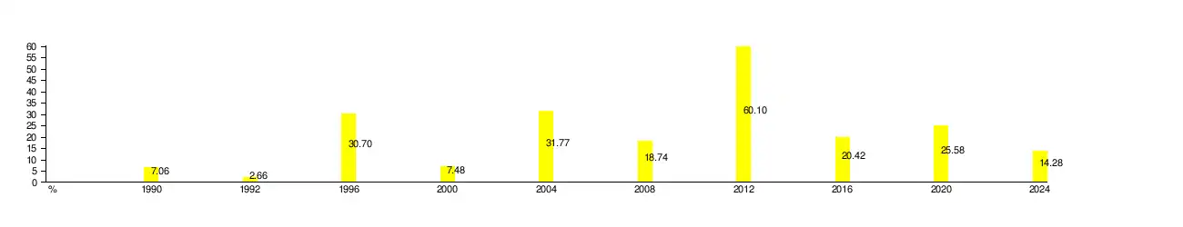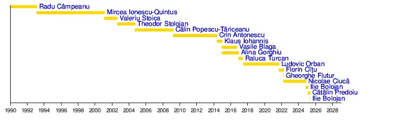 Nevertheless, after a change of leadership that saw Ionescu-Quintus as the new party leader elected in 1995, the PNL contested the 1996 general election once again as part of the CDR.[26] The 1996 general elections represented the first peaceful transition of power in post-1989 Romania, with the PNL, PNȚCD, Democratic Party (PD), and the UDMR forming a grand coalition that pushed the PDSR (formerly the FSN and FDSN) in opposition for the period 1996–2000. Furthermore, the presidency was also won by the CDR's common candidate, more specifically Emil Constantinescu, who received endorsement on behalf of all of the alliance's constituent parties (including the PNL political groups therein).