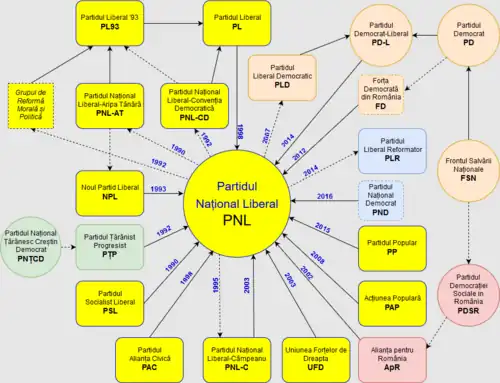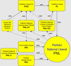 Flowchart showcasing the liberal political groups which seceded from and were subsequently integrated within the National Liberal Party during the 1990s (all with the exception of PNL-C).
