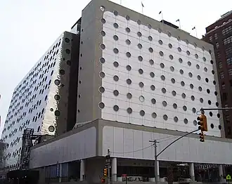 In 1958 the union decided on an aggressive building program, and hired New Orleans–based architect Albert C. Ledner to design some unique buildings for them, including a headquarters building at Seventh Avenue between 12th Street and 13th Street, completed in 1964, a block-through service annex at 346 West 17th Street and a plaza and "pizza-box"-shaped companion building next to it on Ninth Avenue, both built in 1966 and both named for Joseph Curran.[12] The Curran buildings held offices for the union and its pension fund, medical and training facilities, dormitory rooms for seaman, a gymnasium, swimming pool and 900-seat auditorium.[14][15]