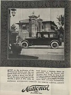 Forced to raise their asking prices to counteract the effects of wartime inflation, National ended up in a higher price range in which they could not compete.[3] For 1920, National dropped their Highway Sixes and Twelves and issued a new model – the Sextet.[3] The Sextet used a Continental side-valve six-cylinder, modified by National engineers with an overhead valve head.[3]