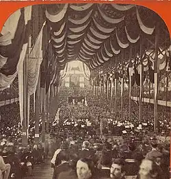 The National Peace Jubilee was a celebration that commemorated the end of the American Civil War, organized by Patrick Gilmore in Boston from June 15–19, 1869. It featured an orchestra and a chorus, as well as numerous soloists. More than 11,000 performers participated, including the famous violinist Ole Bull as the orchestra's concertmaster,[1] and Carl Zerrahn as director of the choral forces.[2] The Jubilee became the "high-water mark in the influence of the band in American life".[3] Along with the World's Peace Jubilee and International Musical Festival in 1872, it made Gilmore a famous composer and bandmaster. For the Jubilee, a newly commissioned "Hymn of Peace" was written by Dr. Oliver Wendell Holmes, set to the music from "American Hymn" by Matthias Keller (1813-1875) and performed on the opening day.[4]