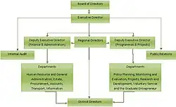 The organogram of the service has a Board of Directors. The Board supervises activities of the executive director and two Deputy Executive Directors. One deputy is the Head of Finance and Administration and the other is in charge of the service's operations. The executive director and the Deputies supervise the activities of the Heads of various Departments.[2] At the regional level, the service is headed by the Regional Director who in turn supervises the work of the various district directors. The service has Regional Heads in all the regional capitals of the country. The service has a staff strength of 342.[2]