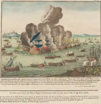 The Turks had lost 2 battleships and 885 captured on 28 June, and perhaps 8 battleships, 2 frigates, 2 xebecs, 1 bomb, 1 galley and 1 transport and 788 captured on 29 June. Russian casualties were 18 killed and 67 wounded in the flotilla, and probably slight losses in the sailing ships.