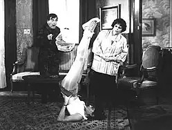 Left to right: Mario Sánchez, Adriana Salgueiro (doing shoulder stand) and Nelly Beltrán, in "Los colimbas al ataque" (1987)