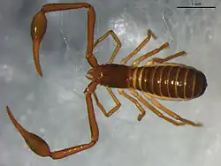 Specimens of Neobisiidae have two very long pedipalps with palpal chelae (pincers) which strongly resemble the pincers found on true scorpions. The pedipalps consists of an immobile "hand" and "finger", with a separate movable finger controlled by an adductor muscle. Contrary to most other pseudoscorpions a venom gland and duct are located in the immobile "finger" part of each pedipalp, rather than in the movable one. The venom is used to capture and immobilize the prey.
