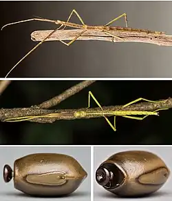 Neophryganistria tamdaoensis, originally described as Phryganistria tamdaoensis, is a species of stick insect belonging to the family of giant stick insects. It was described in 2014 based on specimens from the Tam Đảo National Park in Vietnam, hence, the specific name tamdaoensis.[3] It was described by Joachim Bresseel and Jérôme Constant, biologists of the Royal Belgian Institute of Natural Sciences (RBINS). In the same paper they also reported the discovery of another new subspecies, Neophryganistria heusii yentuensis, which – measuring 32 cm long – is the second biggest insect known to date.[4] In contrast, P. tamdaoensis, measuring only 23 cm long, is one of the smallest species under giant sticks.[5]