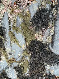 Neorhodomela larix, commonly known as black pine, is a species of red algae native to coastal areas of the North Pacific, from Mexico to the Bering Sea to Japan. It forms dense mats on semi-exposed rocks in intertidal areas. The thallus is dark brown to black in color with whorled branches resembling a bottlebrush or a pine tree's branches.[1][2]