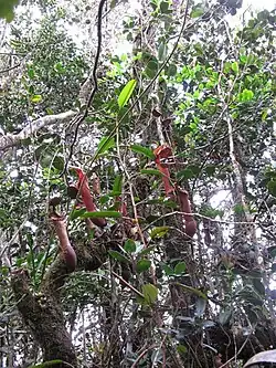 Contrary to the observations of Frederick William Burbidge,[43] N. edwardsiana grows not only as an epiphyte, but also occurs terrestrially on moss-covered rocks. It typically grows amongst ridge-top vegetation in dense mossy forest.[5] The natural habitat of N. edwardsiana is constantly moist[44] as the slopes are often enveloped in clouds.[5] Despite generally occurring epiphytically, N. edwardsiana seems to grow mostly in areas with ultramafic soils,[5] although it has also been recorded from sandstone substrates.[4]
