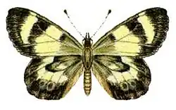 As adults, they are quite similar in appearance with both males and females reaching 32–42 mm (1.3–1.7 in) in wingspan.[5] Their wings are relatively narrow with the rounded termen and a very hairy basal area. Upperside: black with either cream or pale-yellow markings, white chequered terminal scale-fringe, cream median band on the fore wing with subapical band being narrower, cream median band on hind wing and two obscure black postmedian dots. Worn specimens tend to have white markings and pale yellow in newly emerged specimens, changing to cream after a few hours. Underside: fore wing is similar to the upperside except has pale yellow markings, with either one or two black obscure subapical dots and numerous white subterminal dots, black ground colour on hind wing with markings of silvery-white, and a sequence of six black postmedian spots ringed with white with the closest tornus being formed by two spots fusing together. The antenna of the fore wing is roughly half the length of the costa with the club being broad; their eyes are hairy; strongly swollen main veins at the base in the fore wing; the cell is roughly half the length of the hind wing; and the male lacks sex-scales.[3]