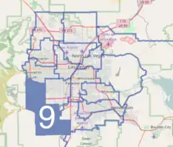 Originally, the 9th district was created after the 2000 census. It first stretched from Northwest Las Vegas into Enterprise and Southwest rural Clark County. The modern District 9 was drawn during a reapportionment after the 2010 Census.[26] The new districts became effective on January 1, 2012 for filing for office, and for nominating and electing senators, and for all other purposes on November 7 – the day after Election Day, when the new senator terms began. The area that the ninth senatorial district occupies is defined in the Nevada Revised Statutes using census tracts, block groups, and blocks.[27]