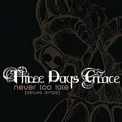 "Never Too Late" is a song by Canadian rock band Three Days Grace. It was released on May 7, 2007, as the third single from the band's second album One-X.[1] Written by Adam Gontier and produced by Howard Benson and Gavin Brown, the song peaked at number 30 on the Canadian Hot 100 and number 71 on the Billboard Hot 100. Additionally, the song topped the US Mainstream Rock chart for seven weeks.