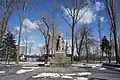 The monument depicts a man embracing a woman and child. On the pedestal is an inscription: NEVER WAR (Polish: NIGDY WOJNY).