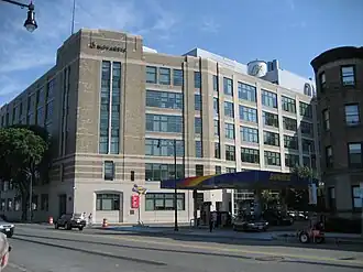 The New England Confectionery Company Factory, also known as the NECCO Candy Factory, is a historic factory complex at 250 Massachusetts Avenue in Cambridge, Massachusetts. The property is now owned by DFS Advisors, and is under long-term lease to Novartis. The complex, which includes the factory building, a power plant, and a modern (2003) parking garage, occupies most of an entire city block bounded by Massachusetts Avenue, Cross Street, Albany Street, and Lansdowne Street. The Moderne-style building was constructed of reinforced concrete, faced predominantly with beige brick and trimmed with limestone. On some facades smooth concrete predominates as the finish surface. The building had a water tower that was painted to resemble a roll of Necco Wafers; during the alterations of the property for use by Novartis, the water tower was retained, and is now painted with a DNA pattern in pastel colors.[2] The building was listed on the National Register of Historic Places in 2005.[1]