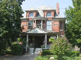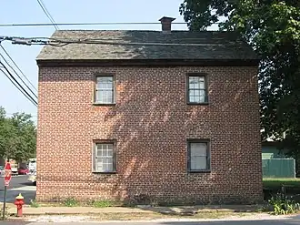 The Harmonists also built timber-frame dwellings for its members. The David Lenz House, circa 1822, is a timber frame, two-story residence typical of the Harmonist period.[22][23] Other Harmonist homes individually listed on the National Register include the Mattias Scholle House, a two-story, brick home of the town's shoemaker built in 1822;[24] the Ludwig Epple House, a two-story frame home built in 1822; and the George Bentel House, another two-story example of brick construction, circa 1822. The Fauntleroy house, an 1822 two-story, frame Harmonist home modified in 1840, was the residence of the Franz Pfeil family, members of the Harmonist Society. Later residents include inventor Oliver Evans Jr. and the family of Robert Henry Fauntleroy and Jane Dale Owen Fauntleroy. The Fauntleroy's daughter, Constance, organized the Minerva Society, a women's literary club, in the home's parlor in 1859.[25][26]