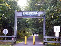 The former New Haven and Northampton right of way is now a trail in Hamden, Connecticut, and bears the logo of the former railroad.