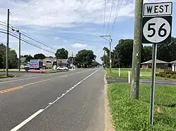 The portion of Route 56 in Vineland was built as a 100-foot (30 m) wide road when Vineland was planned in the 1860s, serving as the main east–west road through the community.[4] In 1938, two separate roads numbered Route 56 were legislated. One was located in Ocean County and was to run from the Laurelton Circle east to Mantoloking; this road was never built.[5] The other was located in the Atlantic City area along U.S. Route 30 (Absecon Boulevard) east of current Route 157; the Route 56 designation on this road was dropped in the 1953 New Jersey state highway renumbering.[6] What is modern-day Route 56 was originally designated as County Route 22 between Route 77 and the Salem County border, County Route 6 in Salem County, and County Route 23 between the Salem County border and Route 47.[7][8] In 1977, Route 56 was legislated onto its current alignment between Route 77 in Upper Deerfield Township and Route 47 in Vineland, replacing County Routes 6, 22, and 23.[8] The route was designated in October 1983.[2]