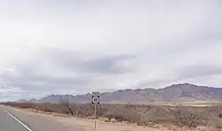 8 miles from the Arizona border, NM 80 intersects the eastern terminus of NM 533. Four miles north of NM 533 is the western terminus of NM 9, which heads east to Animas and Columbus.[4] Continuing north, NM 80 passes Rodeo Airport, then curves northeast, skirting the base of both Granite Peak and Blue Mountain.[2] At the eastern base of Blue Mountain is the western terminus of NM 143.[4] NM 80 then makes a straight shot north through a desolate flat desert landscape until it reaches Roadforks. The small unincorporated area has a few service stations and small businesses for both NM 80 and I-10 travelers.[2] NM 80 continues for a few hundred feet north, before ending in a trumpet interchange at I-10 Exit 5.[1][2] While NM 80 ends here, US 80 would have continued east along much of the current route of I-10 to the Texas border.[3]