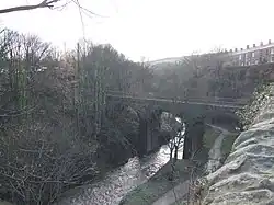 The Torrs is a gorge through Woodhead Hill Sandstone in New Mills. The River Sett approaches its confluence with the River Goyt. Spanning the Sett is the 1864 viaduct on the Hope Valley Line, which has emerged from a tunnel on the right, under Union Road.
