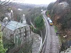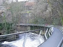 New Mills Central railway station lies 70 feet (21 m) above the River Goyt in the Torrs. Beneath the railway is the Millennium Walkway, with Torr Vale Mill on the opposite bank
